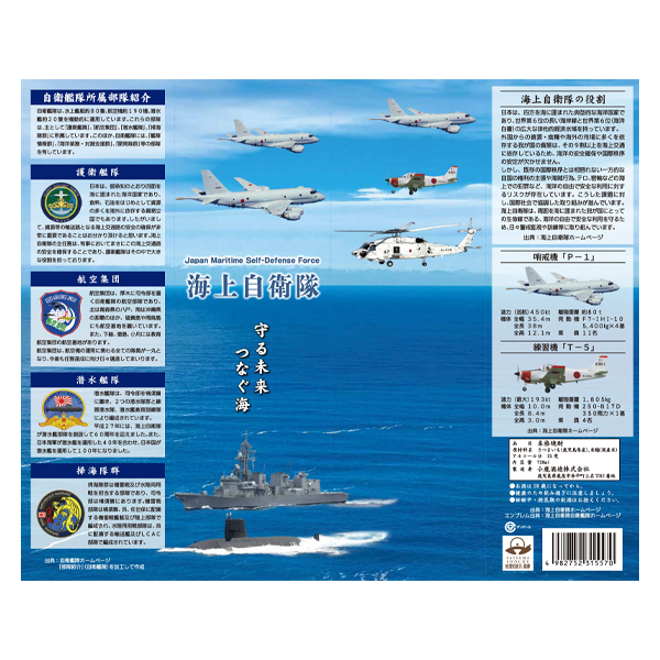海上自衛隊創設70周年を記念として発表されたキャッチフレーズ「守る未来、つなぐ海」と、海上自衛隊が保有する艦艇・航空機の迫力あるビジュアルを化粧箱およびラベルにあしらいました。